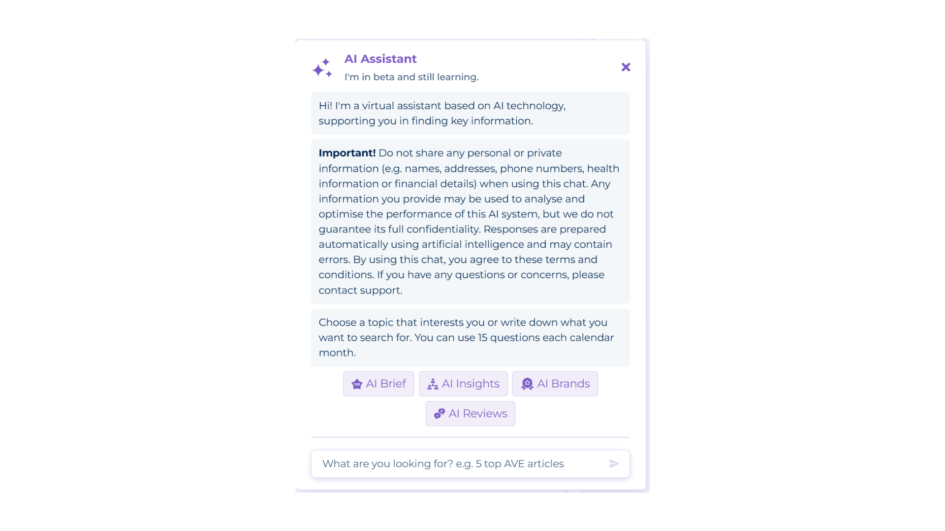 Asystent AI jest wsparciem w filtrowaniu i wyszukiwaniu monitorowanych materiałów. Pojawia się jako okienko czatu i zachęca do wpisywania zapytań. Asystent rozumie język polski i angielski, potrafi zinterpretować zapytanie użytkownika i przedstawić oczekiwany wynik w formie listy materiałów na Platformie. Pomoże znaleźć treści z wybranym słowem kluczowym, o określonym zasięgu, AVE czy wydźwięku publikacji.