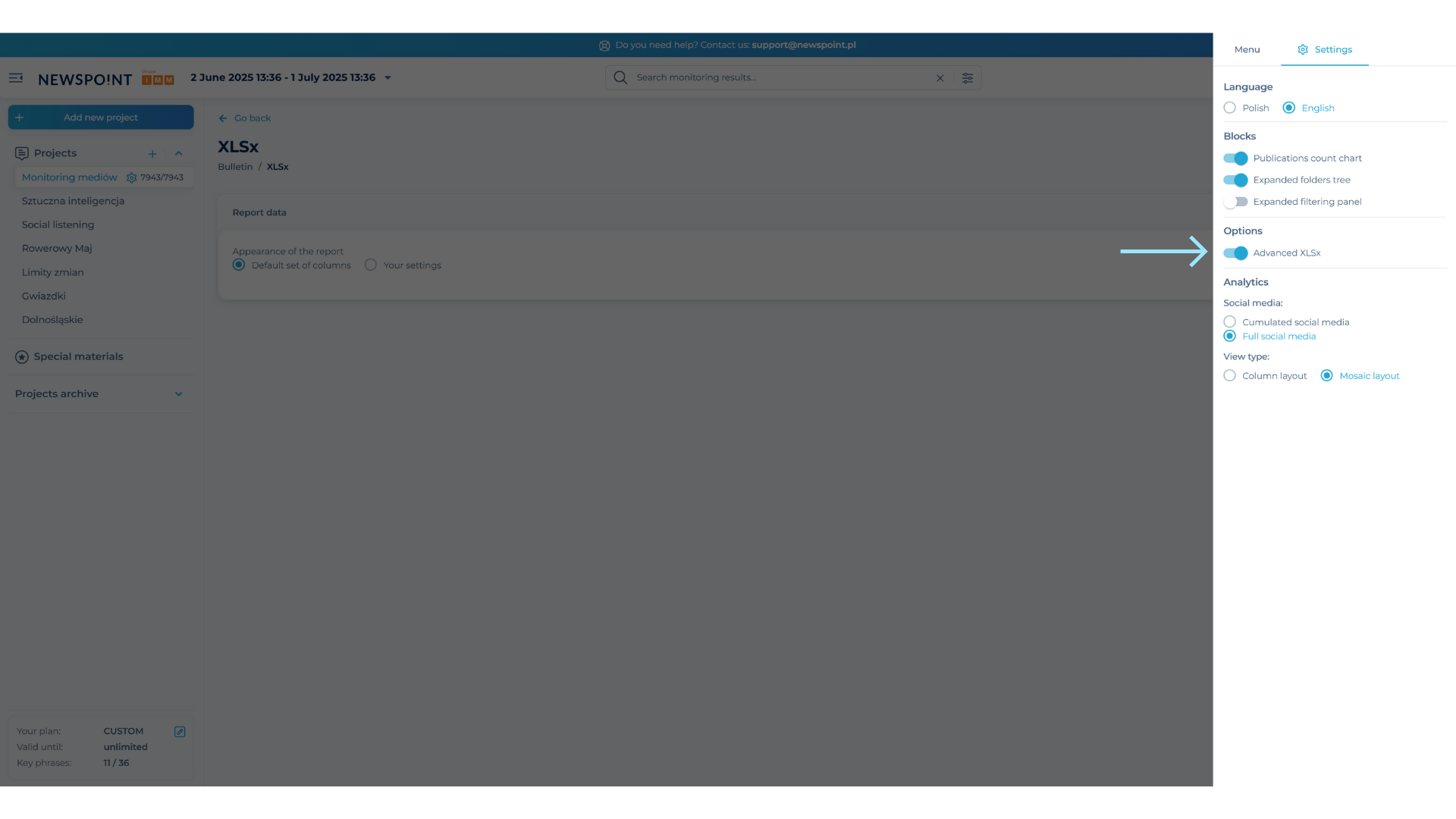 The Platform Layout Settings features the option of activating the advanced XLSx, which allows you to select one of two options of downloading the report:
